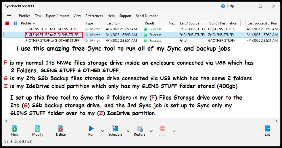 Hi, i use to run a scheduled Sync job for my F/GLENS STUFF to Z/GLENS STUFF but i ended up deleting it and i now run that Sync job manually when i have changed or added anything new to that folder, i have the SyncBackFree app on my desktop and i open it and hit the Run button, it has never failed to do the job in 4 years that i have had IceDrive.